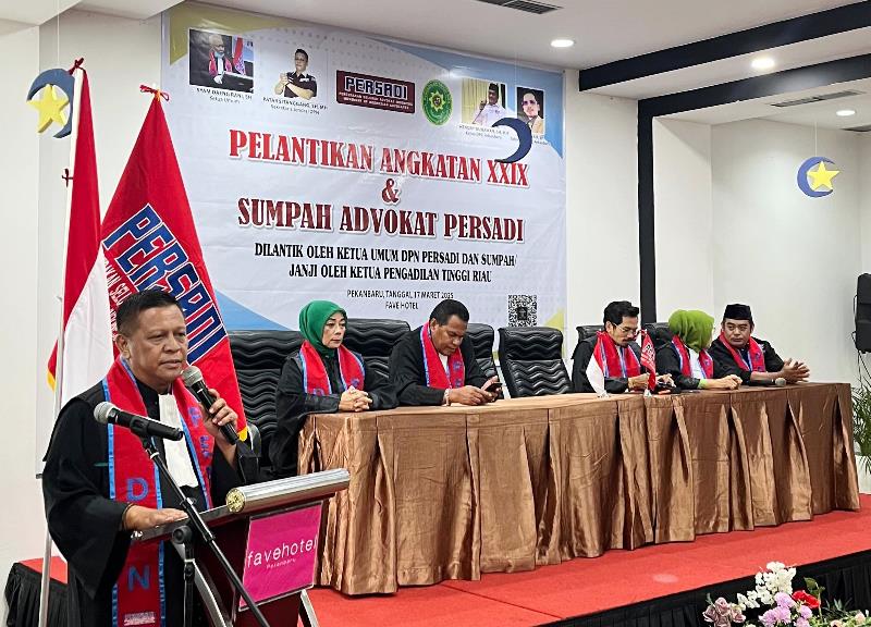 Penyumpahan Advokat Persadi berlangsung khidmat di ruang sidang lantai I Pengadilan Tinggi Riau. Pengambilan sumpah dipimpin langsung Ketua Pengadilan Tinggi Riau Asli Ginting, SH, MH disaksikan Hakim Tinggi Dedy Hermawan, SH, MH dan Sukri Sulumin, SH, MH.