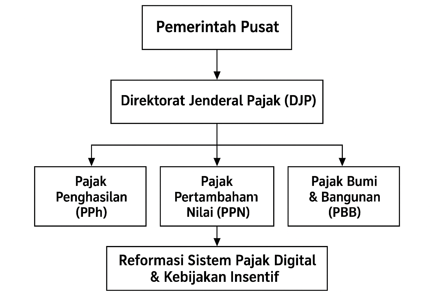 Bagan di bawah ini menggambarkan struktur kebijakan perpajakan di Indonesia secara sederhana. Pemerintah pusat melalui Direktorat Jenderal Pajak membawahi tiga jenis pajak utama, yaitu Pajak Penghasilan (PPh), Pajak Pertambahan Nilai (PPN), dan Pajak Bumi dan Bangunan (PBB). Ketiga jenis pajak ini merupakan kontributor terbesar terhadap pendapatan negara. Melalui reformasi sistem perpajakan digital dan pemberian kebijakan insentif, pemerintah berupaya meningkatkan efektivitas pengumpulan pajak dari berbagai sektor ekonomi.