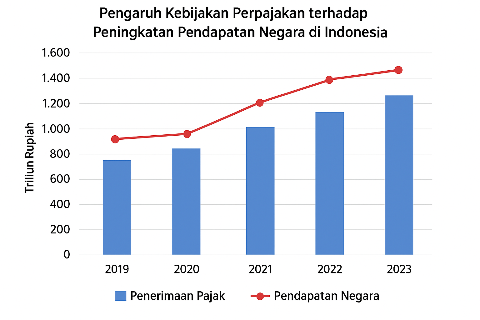 Selain melalui restrukturisasi sistem dan digitalisasi, kebijakan perpajakan juga berdampak langsung pada peningkatan penerimaan negara. Berdasarkan data Kementerian Keuangan, penerimaan pajak Indonesia meningkat secara signifikan dalam lima tahun terakhir. Grafik di bawah ini menunjukkan tren peningkatan penerimaan pajak dari tahun 2019 hingga 2023. Pada tahun 2019, penerimaan pajak tercatat sebesar Rp1.545 triliun, sempat menurun menjadi Rp1.285 triliun pada 2020 akibat pandemi COVID-19, kemudian meningkat menjadi Rp1.547 triliun pada 2021, Rp2.034 triliun pada 2022, dan mencapai Rp2.595 triliun pada 2023. Peningkatan ini menandakan bahwa kebijakan perpajakan yang diterapkan pemerintah mampu memulihkan pendapatan negara pasca krisis dan memperkuat fundamental fiskal Indonesia.
