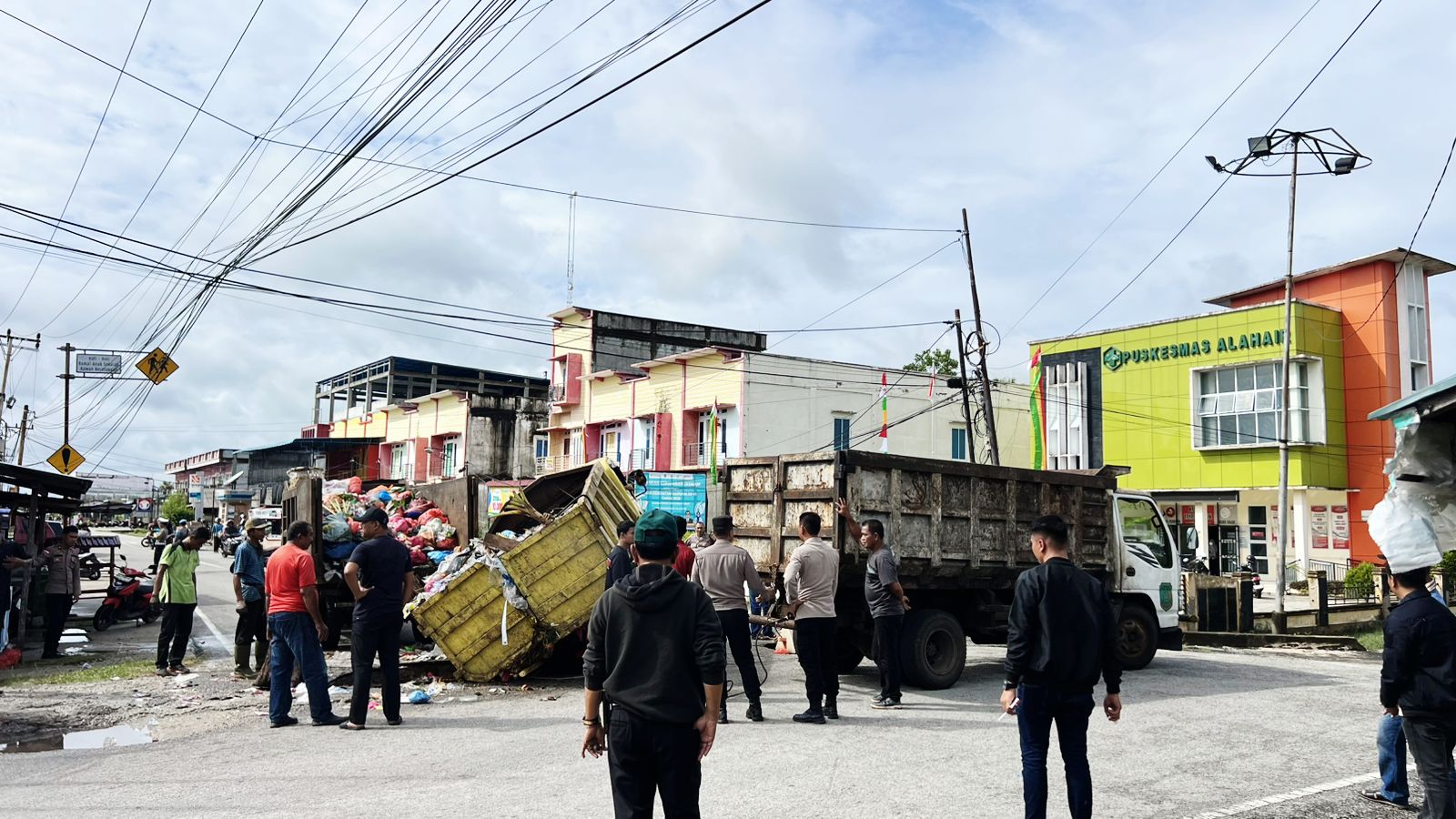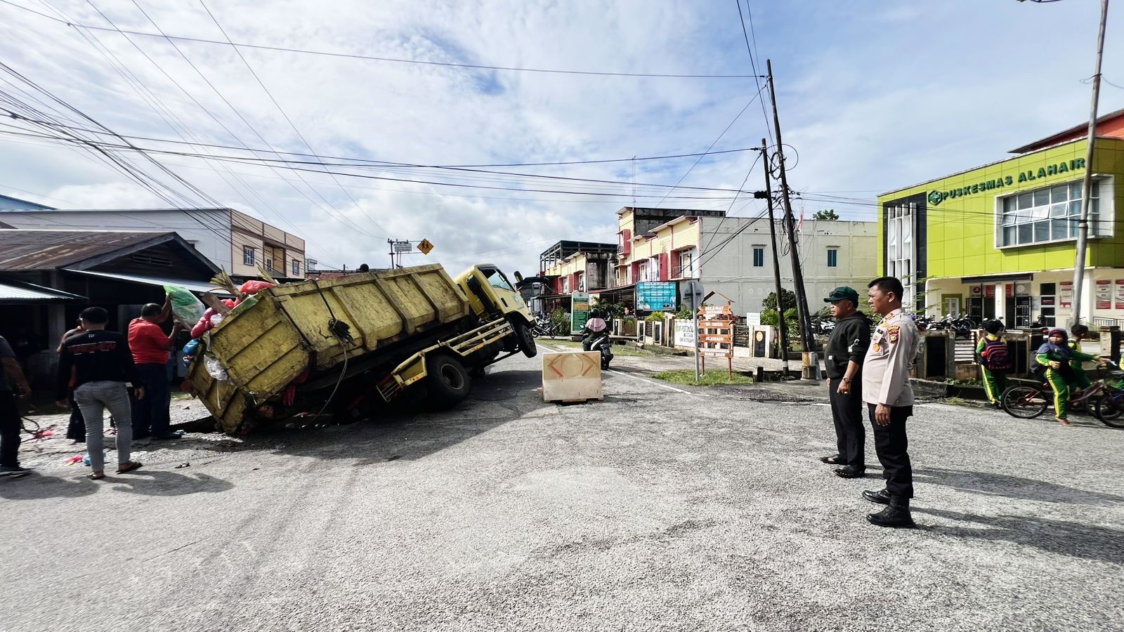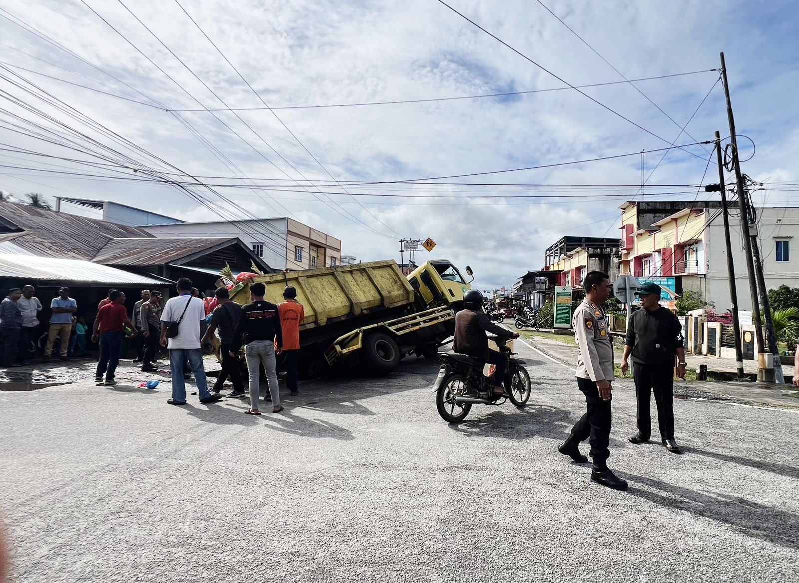 Peristiwa tersebut menyebabkan sebuah dump truk pengangkut sampah terperosok dan sempat mengganggu arus lalu lintas di jalur utama aktivitas masyarakat.